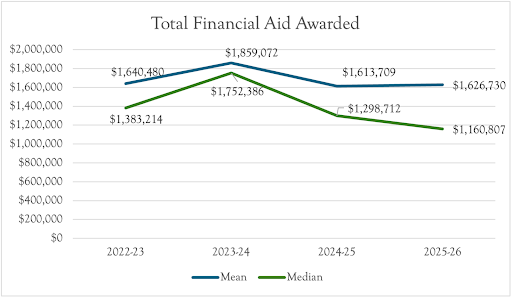 This year’s benchmarking report also sheds light on how CESA schools are investing in financial aid.  While we see the total number of applications for financial aid has risen over the past four years by nearly 20% (see figure 3), the amount of financial aid awarded has largely stayed flat (See figure 4). This observation, in our estimation, is worth consideration.  Why, for example, have the number of applications risen?  Has the number of awards risen proportionately?  Does that then indicate that the awards are also smaller in a season where tuition has risen, on average, by over 10%? Has that had an impact on overall enrollment? Does your financial aid committee have a long-term strategy, connected to a strategic financial plan and enrollment plan, to ensure we are serving the right students for our mission?  While these conversations are complex, the reality is that each school must have a plan for using financial aid purposefully to achieve its strategic priorities.