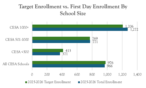 There is, however, a caveat to these encouraging averages. As a whole, CESA schools enrolled slightly fewer students on the first day of the 2025-26 school year than planned for (See Figure 2).  Our largest schools, those over 1000, outperformed that average, however. Those schools enrolled 5.4% more students on opening day than their targets, while schools under 500 were, on average, 10.5% below their targets. It is worth exploring, especially for our mid-sized and smaller schools, how the local market, as well as admissions and marketing staffing (more on staffing in the full report), may be impacting student enrollment.